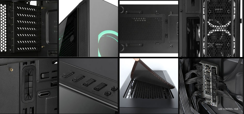 ● در کیس T500 X Gaming امکان نصب حداکثر شش درایو “2.5 و دو درایو “3.5 فراهم شده است.همچنین قابلیت نصب خنک کننده های آبی (واترکولینگ) با ابعاد 120/140/240/280/360mm وجود دارد.امکان نصب 9 عدد فن 120mm در قسمت های پشت بالا و جلوی کیس و یا 6 عدد فن 140mm در قسمت های جلو و بالای کیس باعث شده است هیچ محدودیتی در جهت نصب انواع مختلف فن و خنک کننده های آبی در کیس T500 Gaming وجود نداشته باشد.